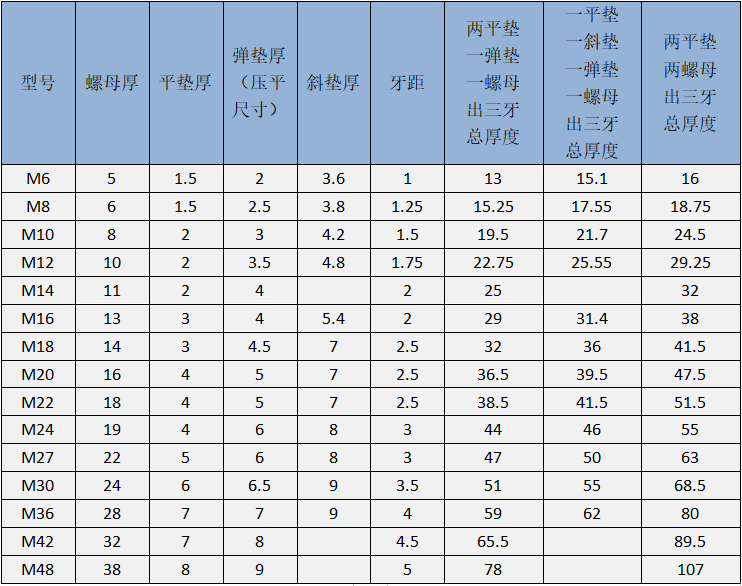 基建施工過程中通常采購熱鍍鋅螺栓為國標(biāo)型,尺寸較為精準(zhǔn)統(tǒng)一。通過對各種型號螺栓的螺母、平墊、斜墊、彈墊、螺距的厚度進(jìn)行測量,得到以下列表。