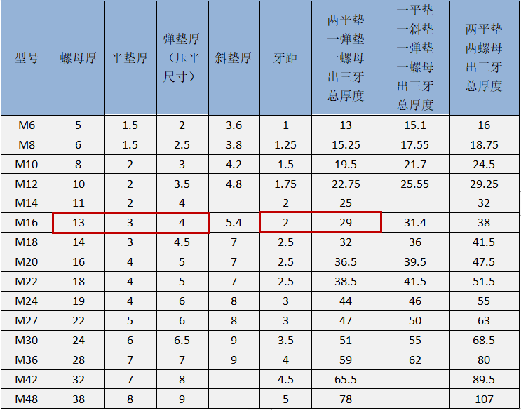 如M16熱鍍鋅螺栓,若采用兩平墊一彈墊一螺母出三牙的方式,則計算螺栓長H=3*2+4+13+2*3=29mm