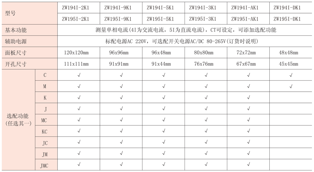注:“√”代表可選配置,“J”代表報(bào)警輸出,“M”代表模擬量輸出,“K”代表開關(guān)量輸入,“C”代表